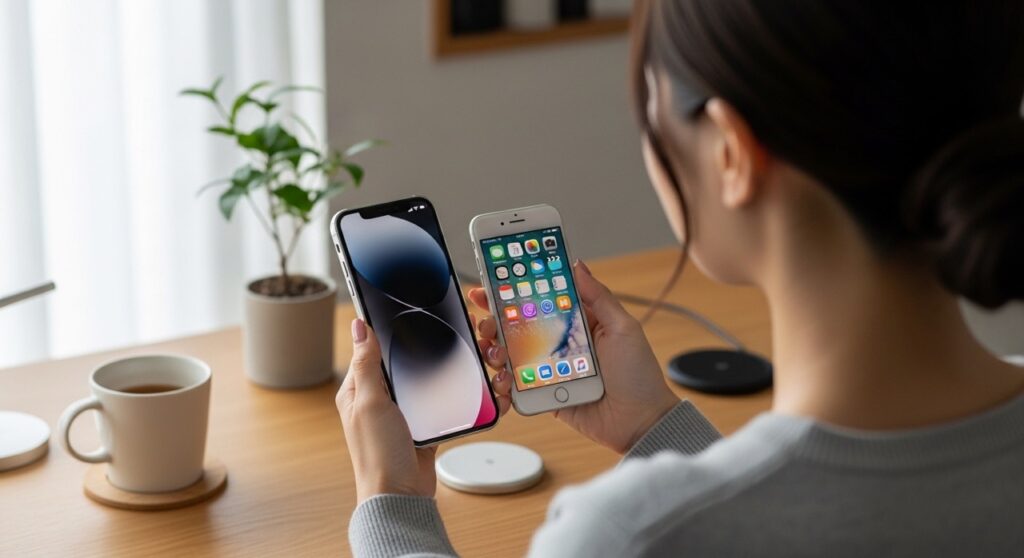 クイックスタートでもこの高速なワイヤレス通信が使われますが、移行元の古い端末がWi-Fi 5(iPhone 11以前など)の場合は、通信がボトルネックになりやすい点に注意が必要です。